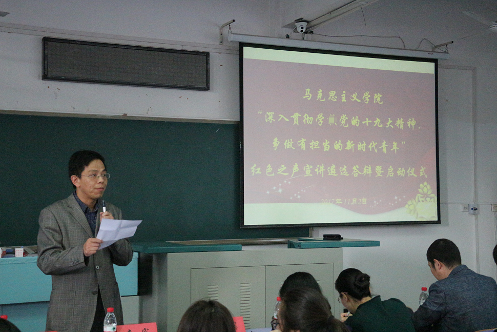 11月2日下午13点,谈球吧“红色之声”宣讲(第八期)启动仪式暨遴选答辩会在教三楼501室举行,主题为“深入学习贯彻党的十九大精神,争做有担当的时代青年”。谈球吧经理高翔莲老师、公司党委书记侯志军老师、公司党委学工部副部长张建和老师、公司党委研工部副部长陈慧老师、公司党委副书记黄少成老师、校团委霍少孟老师、公司团委书记王艳波老师以及兼职辅导员董树婷学姐应邀担任本次活动的评委嘉宾。公司党委副书记黄少成老师主持启动仪式。