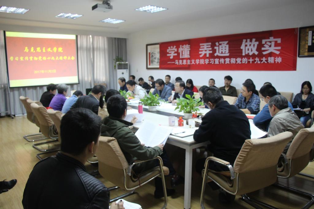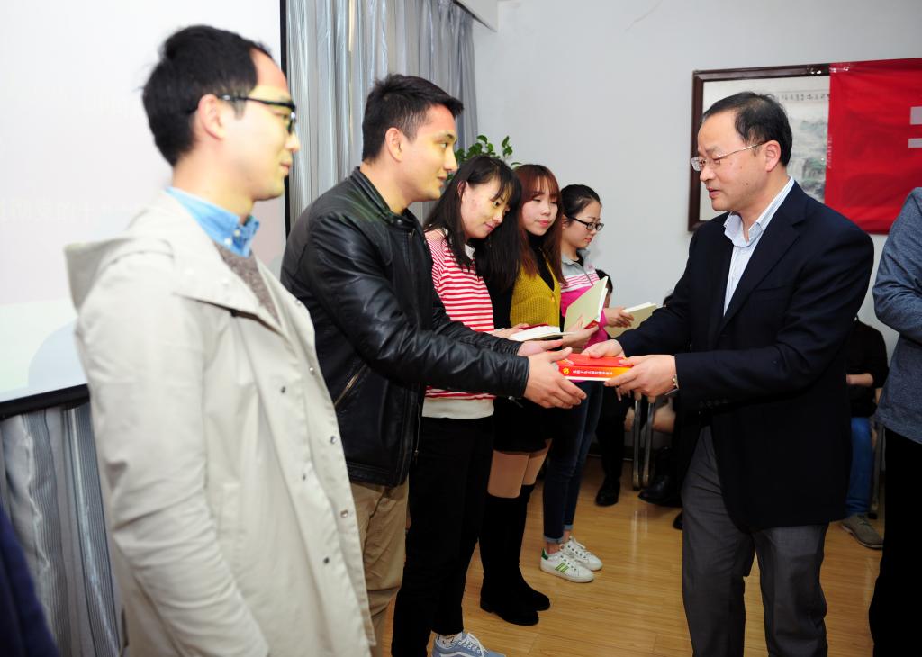何光彩为教工党员、员工代表发放新的《中国共产党章程》、《党十九大报告辅导读本》和《习近平总书记关于高等教育重要论述摘编》等学习资料。