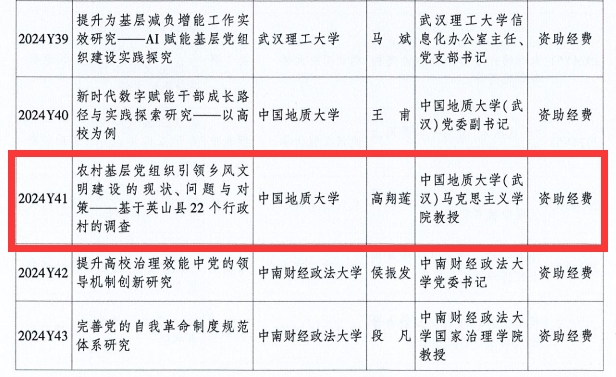 (通讯员:陈越)近日,中共湖北省委党的建设工作领导小组办公室、湖北省党的建设研究会发布《关于2024年度湖北省党的建设研究课题立项情况及有关事项的通知》,公司高翔莲教授主持申报的《农村基层党组织引领乡风文明建设的现状、间题与对策——基于英山县22个行政村的调查》成功获批专项课题立项。