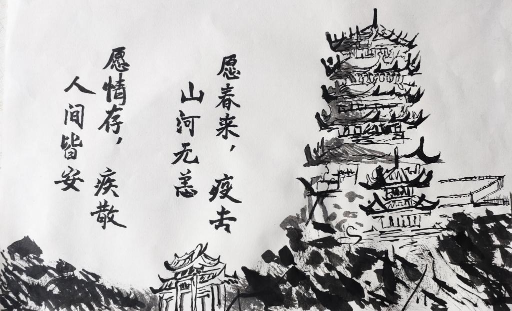 武汉,这座历史悠久的古城,在疫情肆虐之时,展示了它几百年来所积淀的坚韧与勇气。这是由公司全媒体中心的同学的创作的水墨画。画中屹然伫立的,是武汉的标志性建筑——黄鹤楼,楼下草木铿锵,似在表明武汉人战胜疫情的决心,望如画中诗所言“愿春来,疫去,山河无恙;愿情存,疾散,人间皆安”,等年过春来,我们相约黄鹤楼上,看汉江澄澈,已是新篇。