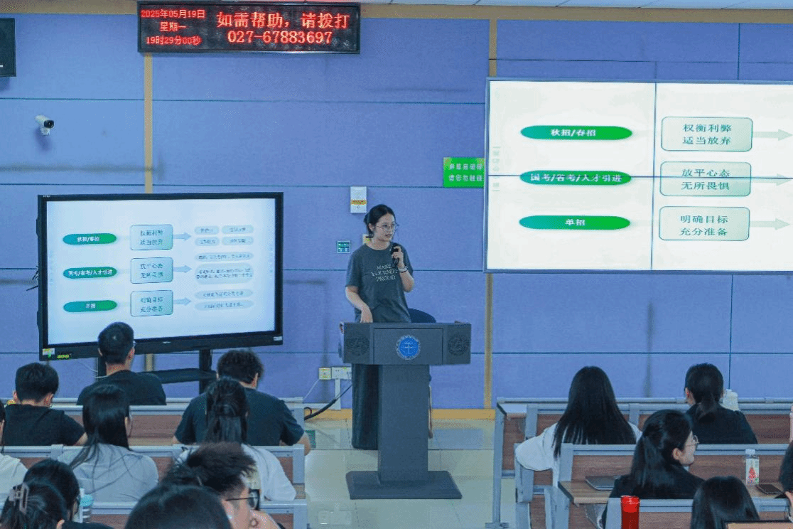 录用岗位为武汉新东方素养智学部教师的曹继乐分享了宝贵经验。他着重强调了教学技能与沟通能力在求职过程中的重要性,并向同学们传授了提升这些能力的有效方法,赢得阵阵掌声。