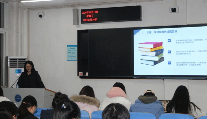 而后,办公室副主任杨燚就如何美化ppt这一主题进行分享。她简要说明ppt在员工工作中起到的重要作用,紧接着通过界面与功能区域、输入和编辑文本内容方法、字体字号颜色设置、数据编辑与样式调整、幻灯片背景填充等角度细致说明美化ppt内容的方法。