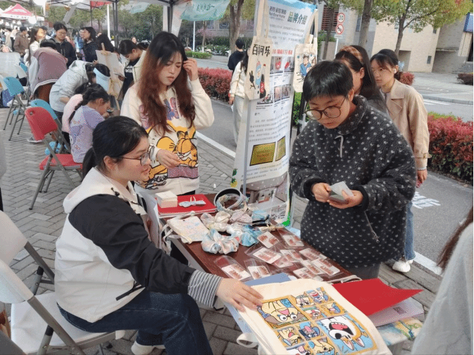 3 月 28 日 14:00,义卖活动正式启幕,未来城校区暖意融融、人气爆棚。义卖摊位整齐陈列,琳琅满目的手工艺品吸引师生纷纷驻足、踊跃选购。本次义卖好物均为残疾人纯手工制作,涵盖非遗大漆漂染发圈、贝壳抓夹、灵动发簪、百搭发箍等饰品,以及托特包、帆布包、手机包等实用好物,兼具非遗质感与日常美感,一针一线尽显匠心,一物一器传递温暖。