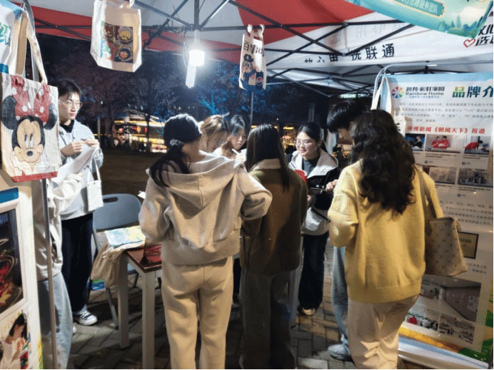为弘扬志愿服务精神,传递助残扶弱正能量,3 月 28 日,谈球吧网页版登录入口(武汉)谈球吧携手润邦・彩虹家园残疾人就业基地,在灯暖未来城・艺聚公益心迎春灯会设置爱心义卖摆摊活动。本次活动由红色之声社团、青马力行志愿服务团队主办,以花灯为媒、以义卖为桥,将非遗匠心、青春活力与公益温情融为一体,点亮校园温暖之夜。