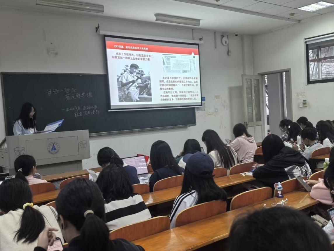 然后,朱一婷同学了讲述摇篮精神的力行悟道,山越高,意志愈坚;岭越远,胸怀愈宽。一个不畏艰难困苦的人,一定会到达光辉的顶点,只有在实习实践过程中见识真问题、思考真问题、解决真问题,一步一个脚印,脚踏实地,知行合一,才能靠近真理之光;摇篮精神中那份赤诚奉献、蔚为国用深深打动着人心,最后,郭雅婕同学将与大家分享摇篮精神的时代意义与价值,摇篮精神托举着一代代地大人在未来的道路上踽踽独行,同时也在中华民族精神征程中立起一座精神丰碑,激励着青年矢志不渝、勇往直前。