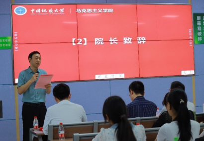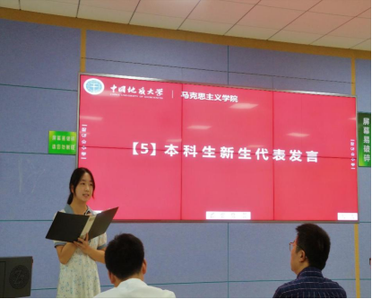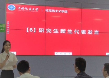 研究生新生代表鲍涵发言。她从考研经历出发,分享两点个人心得。一是以积极主动之姿、无惧困难之态勇攀知识的高峰,二是以自我追逐之勇,不忘初心之诚拓展生命的宽度。她倡议同学们不负来时路,牢记艰苦朴素、求真务实的地大精神,做敏而好学、砥砺深耕、成大志、明大德、成大材、担大任的谈球吧学子。