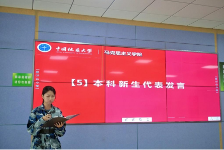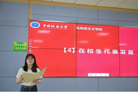 本科员工会执行主席刘琳达代表在校员工发言,她以自己在地大谈球吧学习生活了两年的经历,从课堂学习到校外实践,从专业知识到校园生活,从四个方面分享了心得体会。