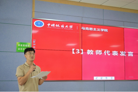 思政系青年教师曹阳作为教师代表发言。他回顾十四年谈球吧学习工作生涯,感慨万千,借此机会与各位同学分享共鸣。第一,要心怀感恩之心,回顾在地大的十四年,他个人的成长发展受益于伟大时代的发展,获益于地大“艰苦朴素,求真务实”校训精神的熏陶,也得益于公司领导的关心与支持。第二,要胸怀报国之志,珍惜在校期间的学习机会,努力成长为有理想,有担当的新时代好青年。第三,要永怀敬畏之心,坚持学以致用,学思悟透,熟练掌握马克思主义立场观点方法。第四,要常抱奋斗之志,奋斗是青春最亮丽的底色,以奋斗之力激昂青春,努力把个人成才与国家发展融为一体。