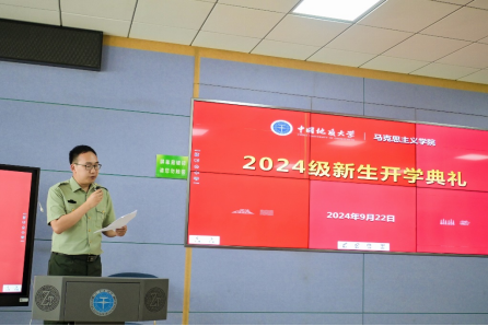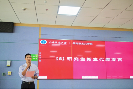 研究生新生代表吴恺文发言。他分享了自己的两段宝贵经历,在原创话剧《大地之光》中扮演李四光先生的经历和作为研究生支教团成员前往云南楚雄支教的经历让他重新审视了自己和教育的关系,思考培养什么人,怎么培养人,为谁培养人的问题,筑牢理想信念,立德树人,思考自己能为公司公司乃至社会做出哪些贡献。
